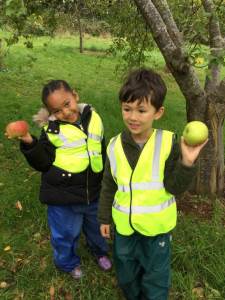 Once we arrived, we gathered to listen carefully to Alice, who helps look after the orchard. She explained which trees we were allowed to pick from. After exploring and picking apples, we sat down together at base camp and enjoyed tasting a variety of delicious apples. We used describing words to talk about the apples. Some were crisp and juicy others were sweet or slightly tangy.